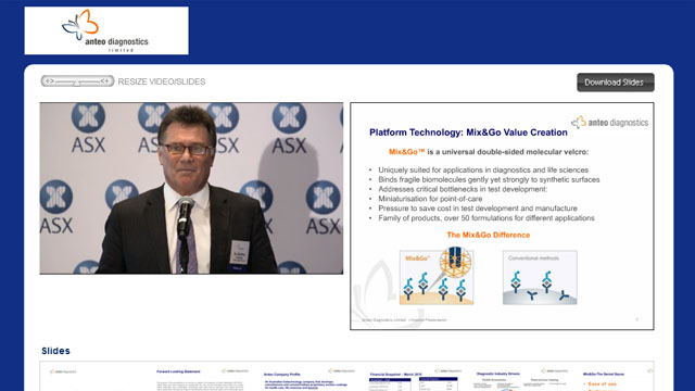 27 Feb 2014 - Anteo Diagnostics Limited (ASX:ADO) CEO Geoff Cumming presents at ASX Spotlight New York and London about the company’s operations in the life sciences sector.