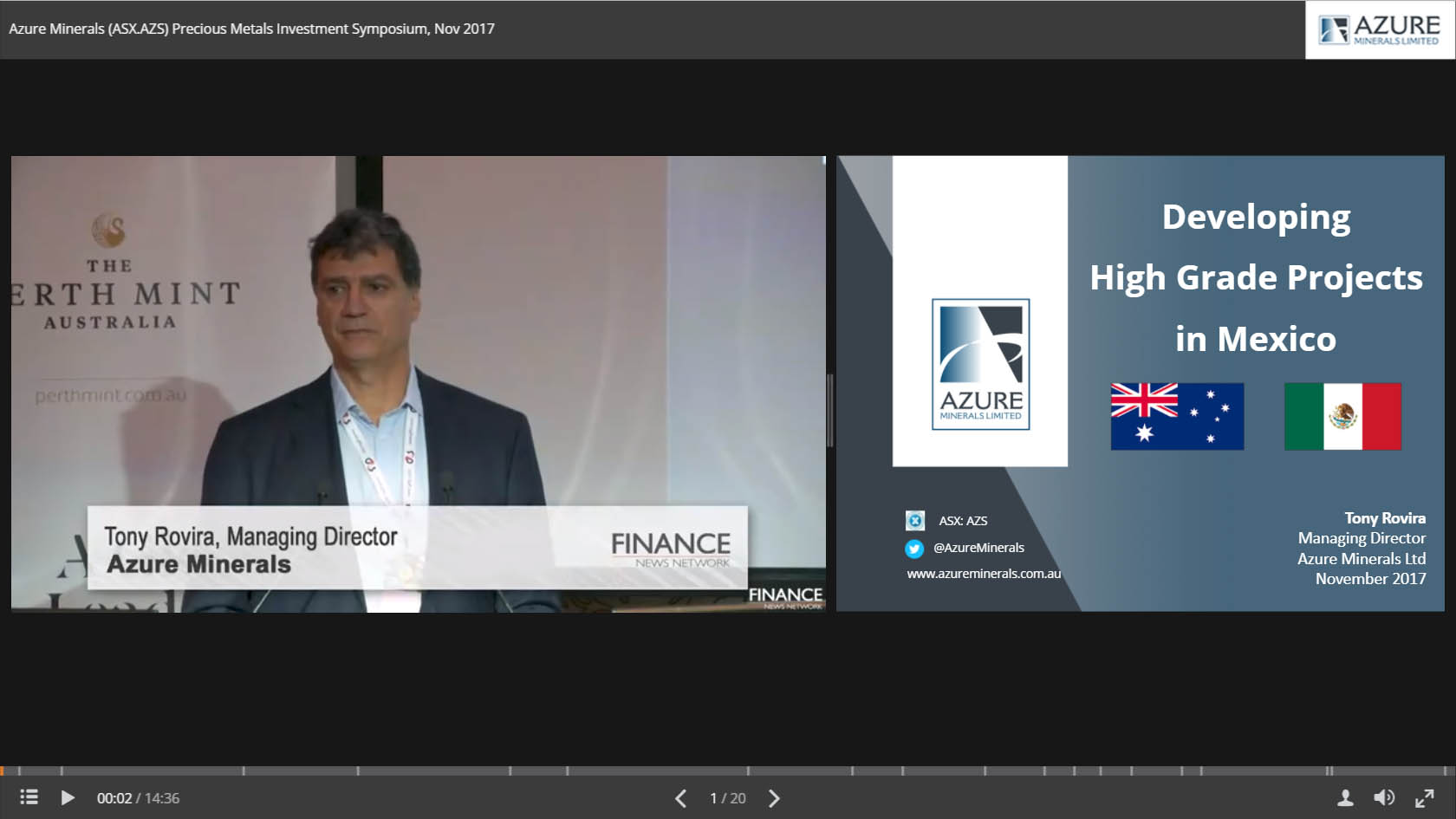 04 Oct 2012 - Azure Minerals Limited (ASX:AZS) Managing Director, Anthony Rovira presents ‘On the Road to Mining in Mexico’ at the RIU Resources Round-up Conference in Melbourne.