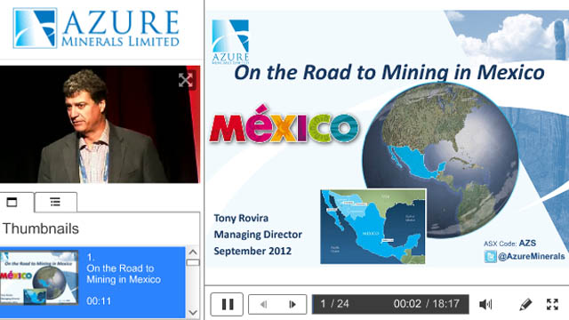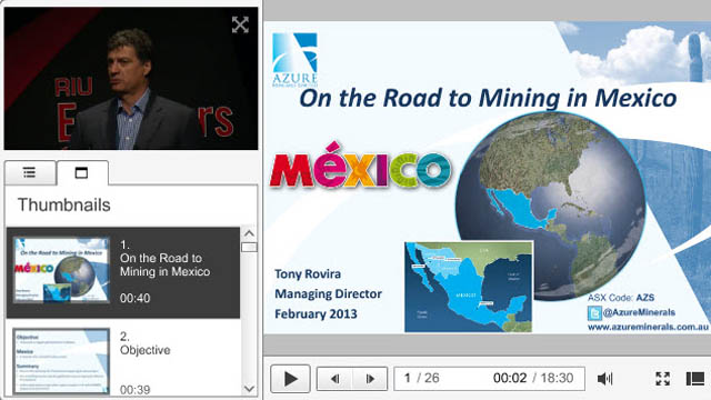 22 Feb 2013 - Azure Minerals Limited (ASX:AZS) Managing Director, Tony Rovira presents ‘On the Road to Mining in Mexico’.
