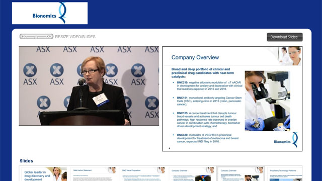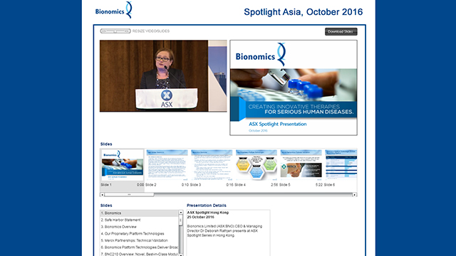 31 October 2016 - Bionomics Limited (ASX: BNO) CEO & Managing Director Dr Deborah Rathjen presents at the ASX Spotlight Series in Hong Kong.