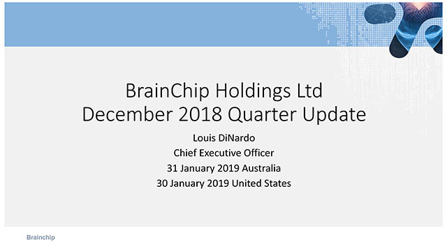 31 Jan 2019 - Neuromorphic computing company BrainChip Holdings (ASX:BRN), reports the company ended the December quarter with US$7.5 million in cash.