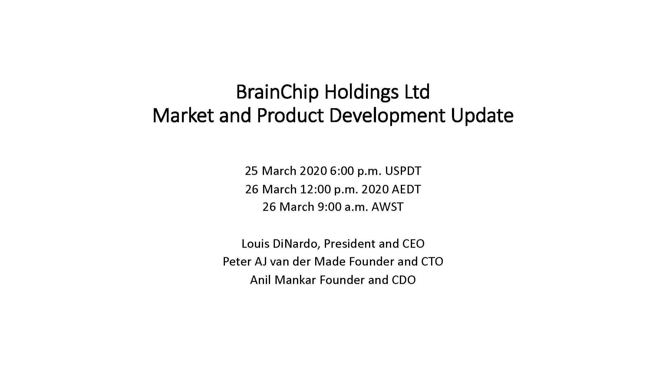 27 Mar 2020 - BrainChip Holdings Limited (ASX:BRN) CEO Louis DiNardo, Founder and CTO Peter van der Made, and Founder and CDO Anil Mankar provide an update on the company.