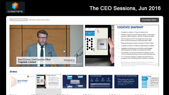 29 Jun 2016 - Cogstate (ASX:CGS) CEO Brad O'Connor talks about the outsourcing trend for cognitive testing as part of the drug approval process.