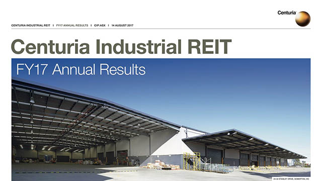 Centuria Industrial REIT (ASX:CIP) is Australia’s largest ASX-listed, income focused industrial property investment vehicle and is included in the S&P/ASX300 index. CIP owns a portfolio of 41 high quality industrial assets with a value of approximately $1.2 billion. The properties are located in key metropolitan locations throughout Australia.