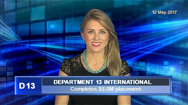12 May 2017 - Department 13 (ASX:D13) has successfully raised $5.5 million before costs, in a share placement to new and existing shareholders.