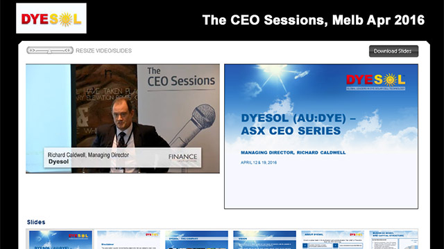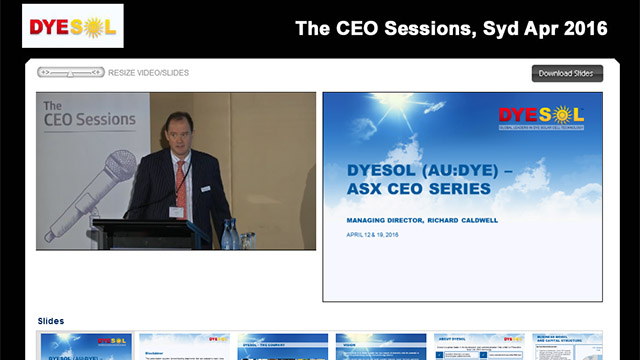 21 Apr 2016 - Dyesol Limited (ASX:DYE) Managing Director, Richard Caldwell discusses the development and commercialization plans for its perovskite solar cell technolo…