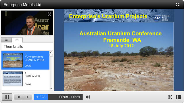 30 Jul 2012 - Enterprise Metals Limited (ASX:ENT) Managing Director, Dermot Ryan presents at the Australian Uranium Conference in Fremantle, Western Australia.