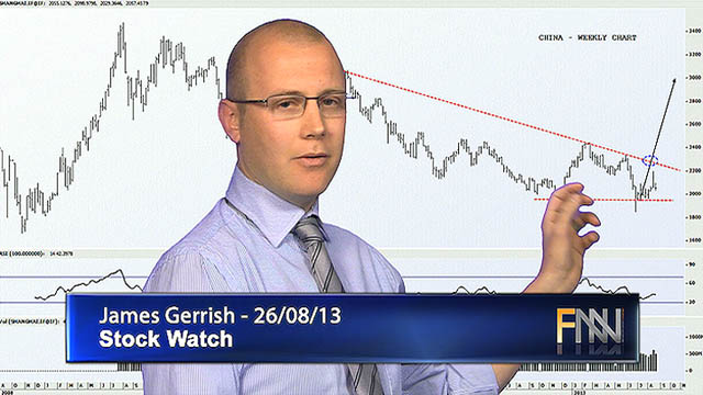 26 Aug 2013 - Investment advisor James Gerrish takes a technical look at DowJones Industrials, Shanghai Composite, S&P/ASX 200, S&P/ASX Materials, Gold, NCM, NST, TLS, IIN, VOC.