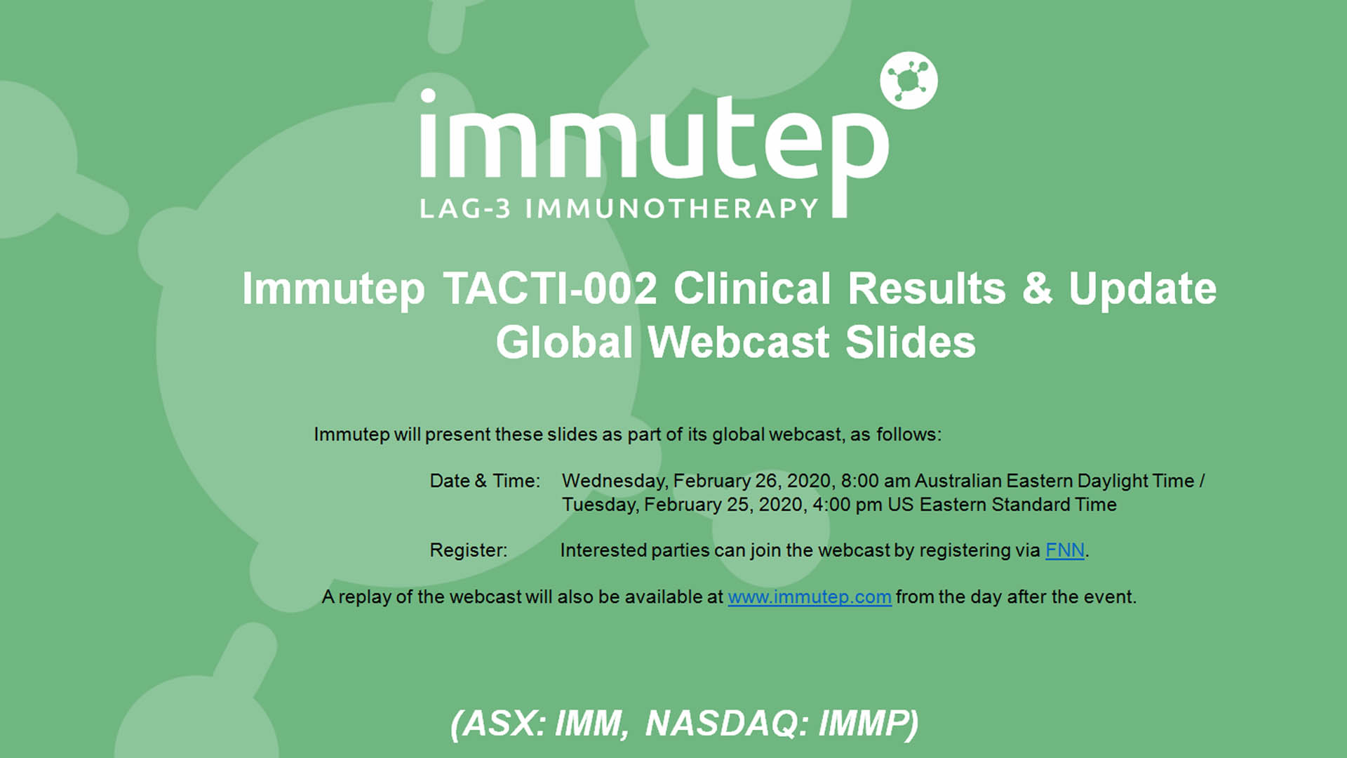 28 Feb 2020 - Immutep Limited (ASX:IMM) Executive Director and CEO Marc Voigt, Chief Scientific and Medical Officer, Dr Frédéric Triebel, and Director of Clinical Development and R…