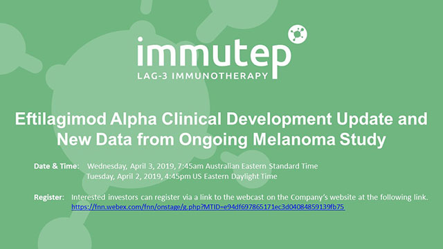 08 Apr 2019 - Immutep Limited (ASX:IMM) CEO, Marc Voigt, CSO & CMO, Professor Frederic Triebel and Director Clinical Development and Regulatory Affairs, Christian Mueller, provide …