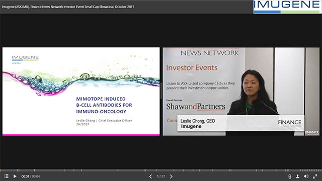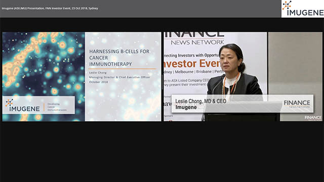Company Presentations / by - 8 years ago Imugene (ASX:IMU) Presentation, FNN Small Cap Investor Event, October 2017, Sydney 12 Oct 2017 - Imugene Limited (ASX:IMU) CEO Leslie Chong presents at the FNN Small Cap Investor Event, October 2017, Sydney.