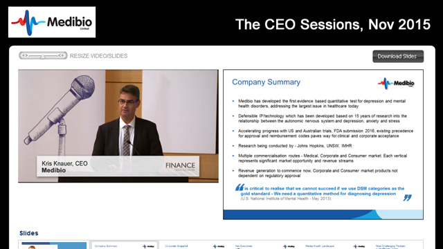 25 Nov 2015 - Medibio Limited (ASX:MEB) Executive Director, Kris Knauer discusses the commercialisation of the company’s depression diagnostic technology.