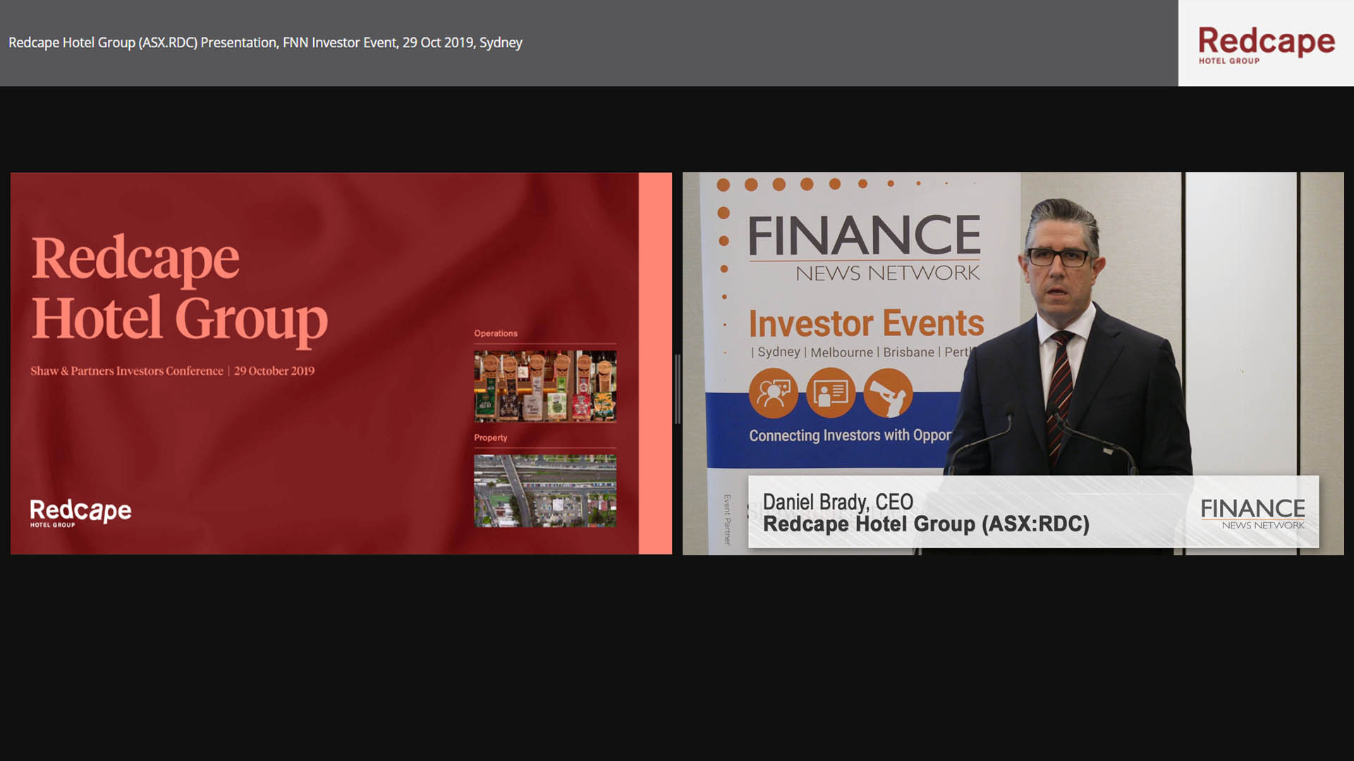 20 Nov 2019 - Redcape Hotel Group Limited (ASX:RDC) CEO, Dan Brady presents on the company’s business overview, major refurbishments, guidance and key priorities at FNN's Investor …