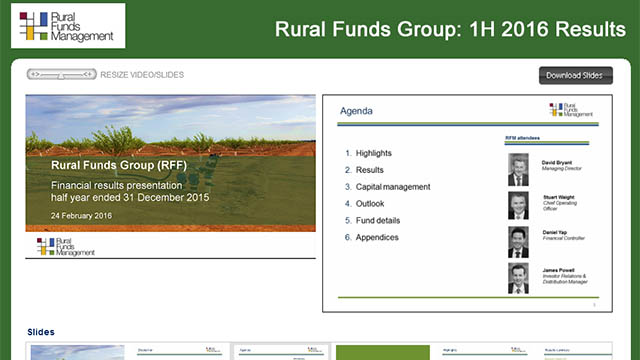 11 Mar 2016 - Rural Funds Group (ASX:RFF) Executive Director, Andrea Lemmon discusses the company’s results for the half year ended 31 December 2015.