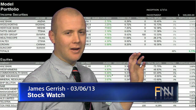03 Jun 2013 - Investment advisor James Gerrish takes a technical look at S&P 500, S&P/ASX 200, PRYHA, NABPA, WBCPD, WBC, ANZ, NAB, CBA & Australian Dollar.