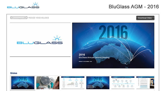 23 November 2016 - BluGlass Limited (ASX:BLG): Chairman George Venardos, Managing Director Giles Bourne, and Chief Technology and Operations Officer Ian Mann, present at the 2016 A…